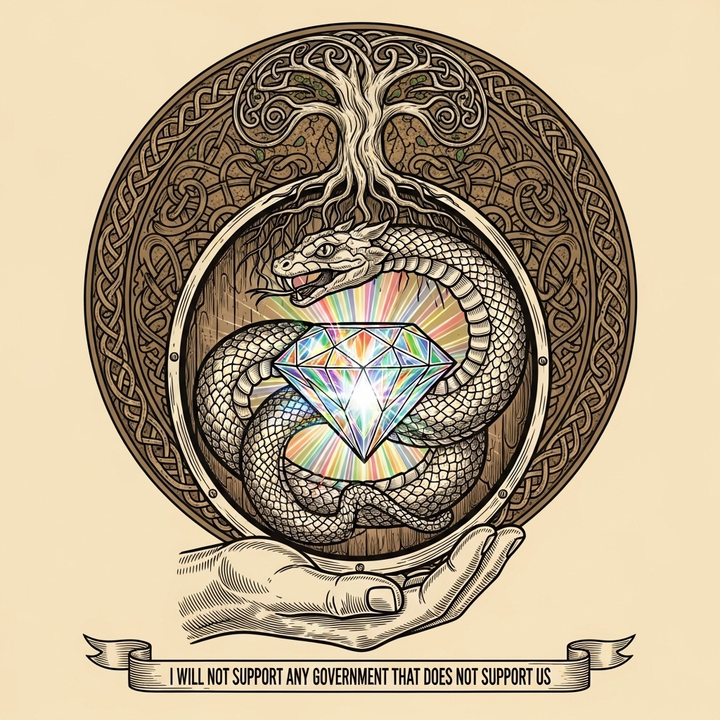 Highly detailed vintage woodcut engraving, sacred crest design. A realistic human hand, seen from below, firmly supports a circular shield at its base. Inside the shield: a brilliant radiant diamond, emitting vivid, multicolored iridescent light, glowing from within, casting soft, divine illumination on the serpent’s underside and lower tree branches, creating a sacred luminous effect. A mythical serpent or dragon arches protectively behind the diamond, body coiled in gentle S-shaped curves along the shield’s interior edge, head alert and pointing outward, ready to defend the gem. Above the shield: an abstract swirling Tree of Life, roots merging into the top edge of the shield. Around the entire emblem: dense, continuous Celtic knotwork border, perfectly circular. Below the crest: a separate banner reading “I WILL NOT SUPPORT ANY GOVERNMENT THAT DOES NOT SUPPORT US.” Style & Lighting Enhancements: Fine engraved linework with consistent hatching across shield, serpent scales, and tree bark. Denser lines in shadows, lighter strokes for highlights. Diamond glow and iridescent rainbow reflections highlight serpent scales and tree tips, without flattening woodcut texture. Serpent scales patterned but not busy; body taut and muscular; head alert with subtle highlight on eyes/forehead ridge. Tree branches spiral naturally, gentle gradient glow at tips; roots taper subtly into shield. Earth-tone background and knotwork (ochre, deep umber, muted greens). Rainbow gradient only in diamond, serpent, and tree highlights. Perfect circular balance: shield, knotwork, tree. Serpent asymmetrical, aligned to diamond, avoiding full circle. Mood: ancient, sacred, resolute, conveying guardianship and collective strength. Negative prompt: warped anatomy, broken symmetry, distorted circle, bad text, ouroboros, full circular snakes.