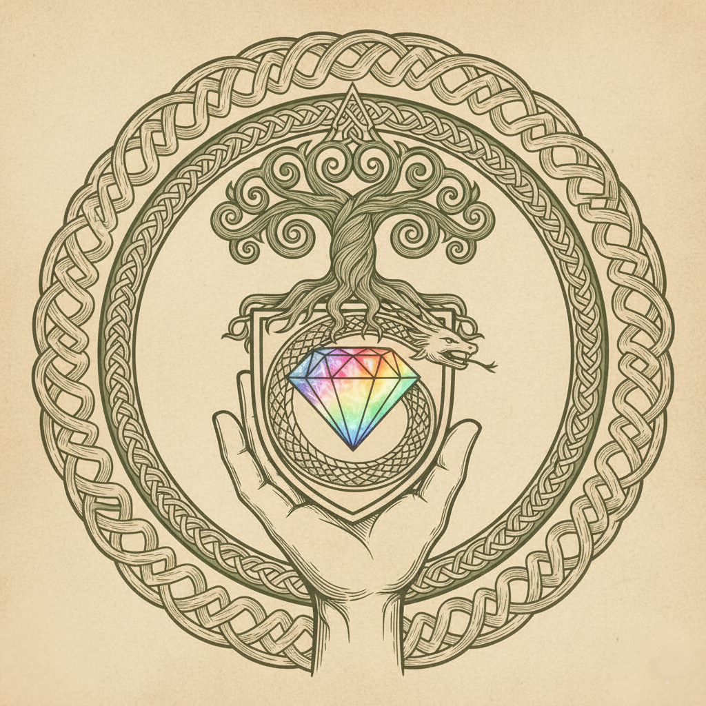 Highly detailed vintage woodcut engraving, circular sacred crest. A realistic hand at the base holds up a round shield. Inside the shield: a radiant rainbow diamond, emitting vivid, multicolored iridescent light, glowing from within, casting soft illumination on the serpent’s underside and lower tree branches. A mythical serpent or dragon arches behind the diamond, body coiled in gentle S-shaped curves, head alert, not forming a complete circle. Above: an abstract swirling Tree of Life with roots blending into the shield’s top rim. Surrounded by unbroken Celtic knotwork ring. Style & Lighting Enhancements: Fine engraved linework with consistent hatching across shield, serpent scales, and tree bark. Denser lines in shadows, lighter strokes for highlights. Diamond glow and rainbow reflections highlight serpent and tree without flattening texture. Serpent scales patterned but not busy; body taut and muscular; head alert with subtle highlight on eyes/forehead ridge. Tree branches spiral naturally, gentle gradient glow at tips; roots taper subtly into shield. Earth-tone background and knotwork (ochre, deep umber, muted greens). Rainbow gradient only in diamond, serpent, and tree highlights. Perfect circular balance: shield, knotwork, tree. Serpent asymmetrical, aligned to diamond, avoiding full circle. Mood: ancient, sacred, resolute, conveying guardianship and collective strength. Negative prompt: text, banners, warped anatomy, broken symmetry, distorted circle, ouroboros, full circular snakes.